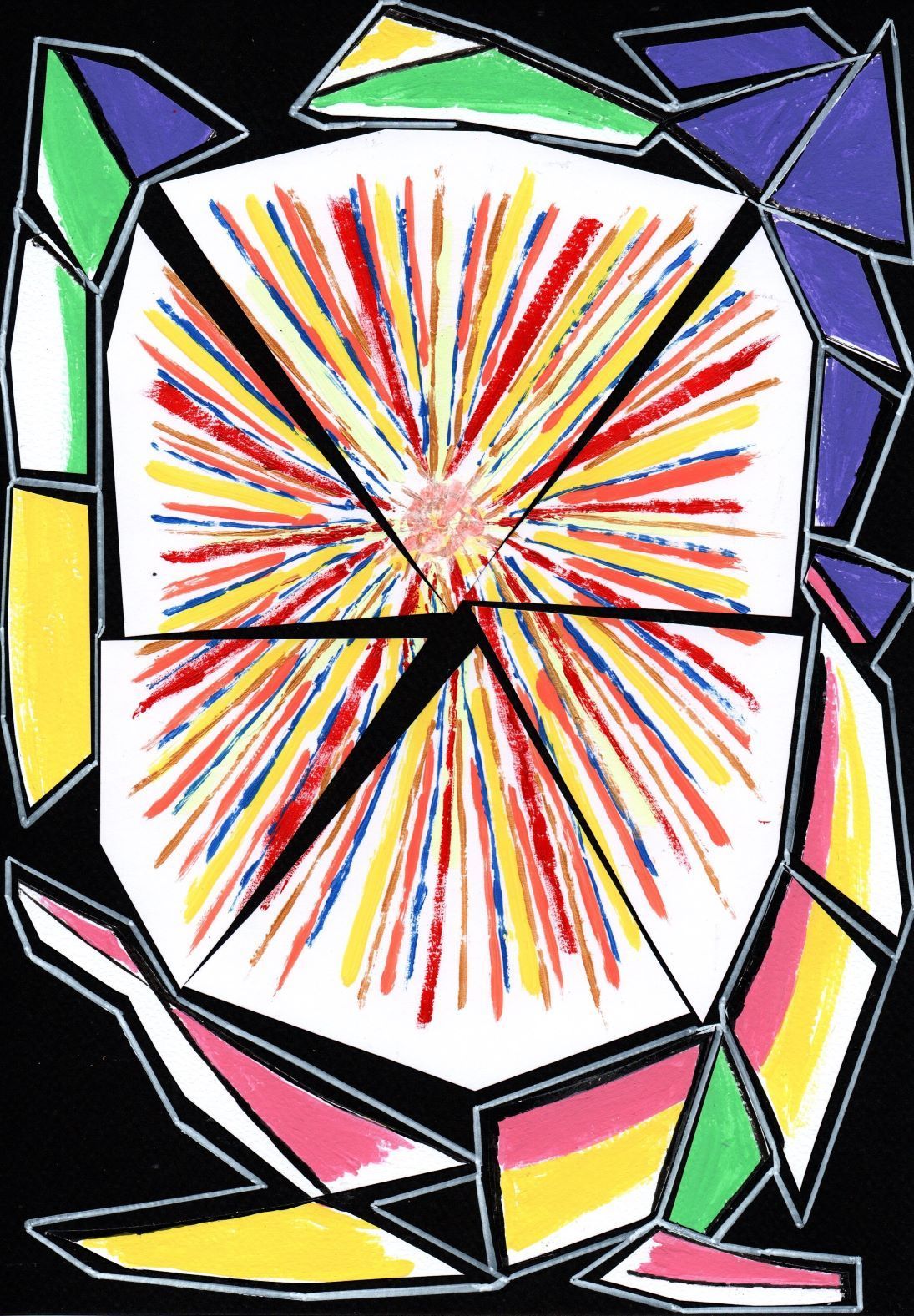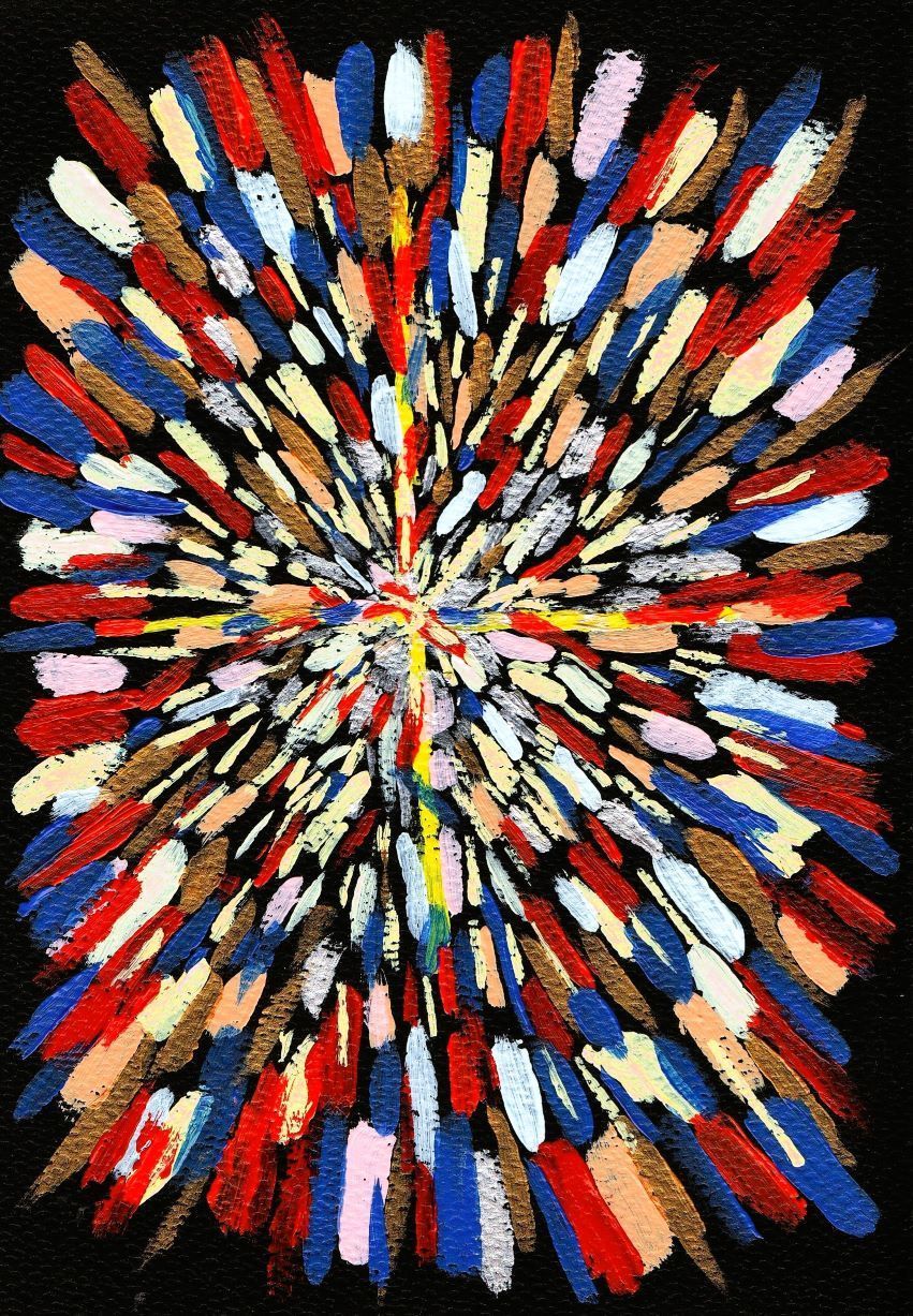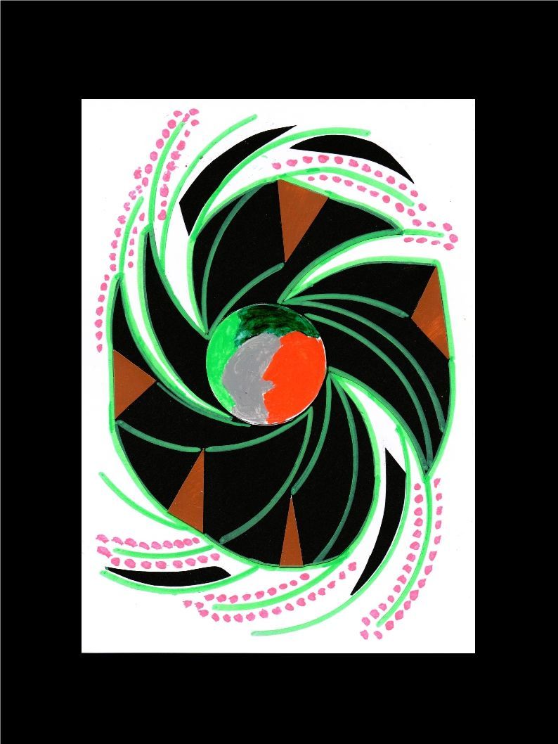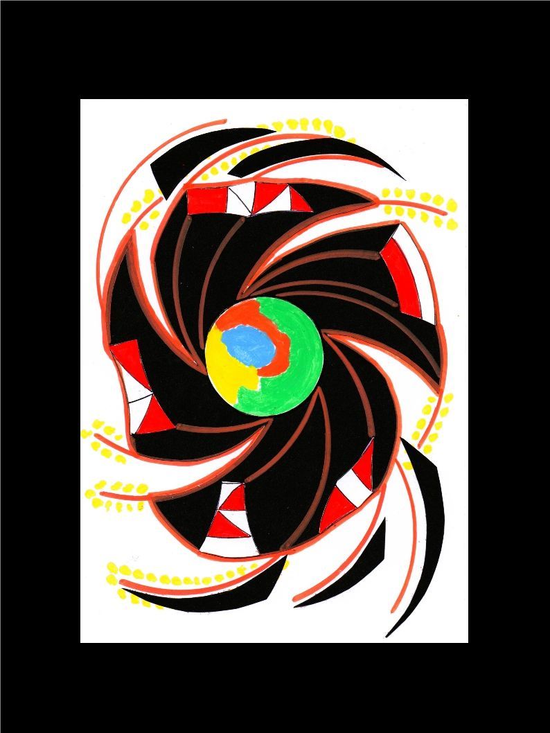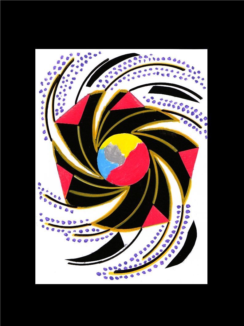 In der Mitte ist ein rotierender Gedanke. Mit jeder Umdrehung schleudert der Gedanke funken, Gedankenfunken in seine Umgebung. Ein Feuerrad voller Energie.