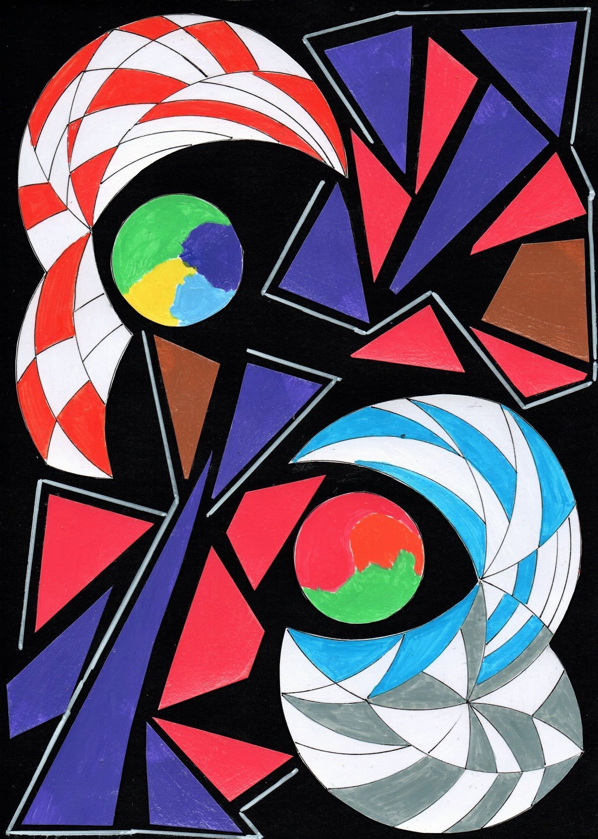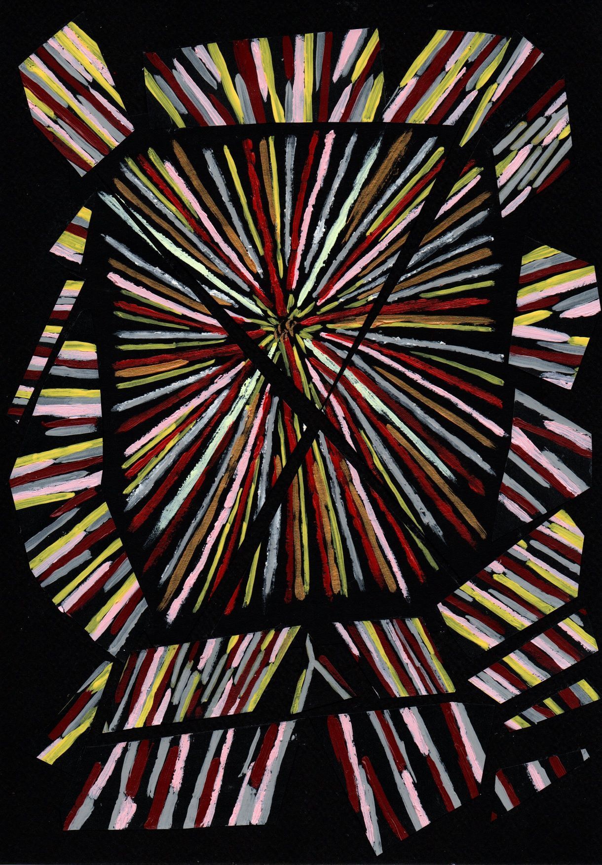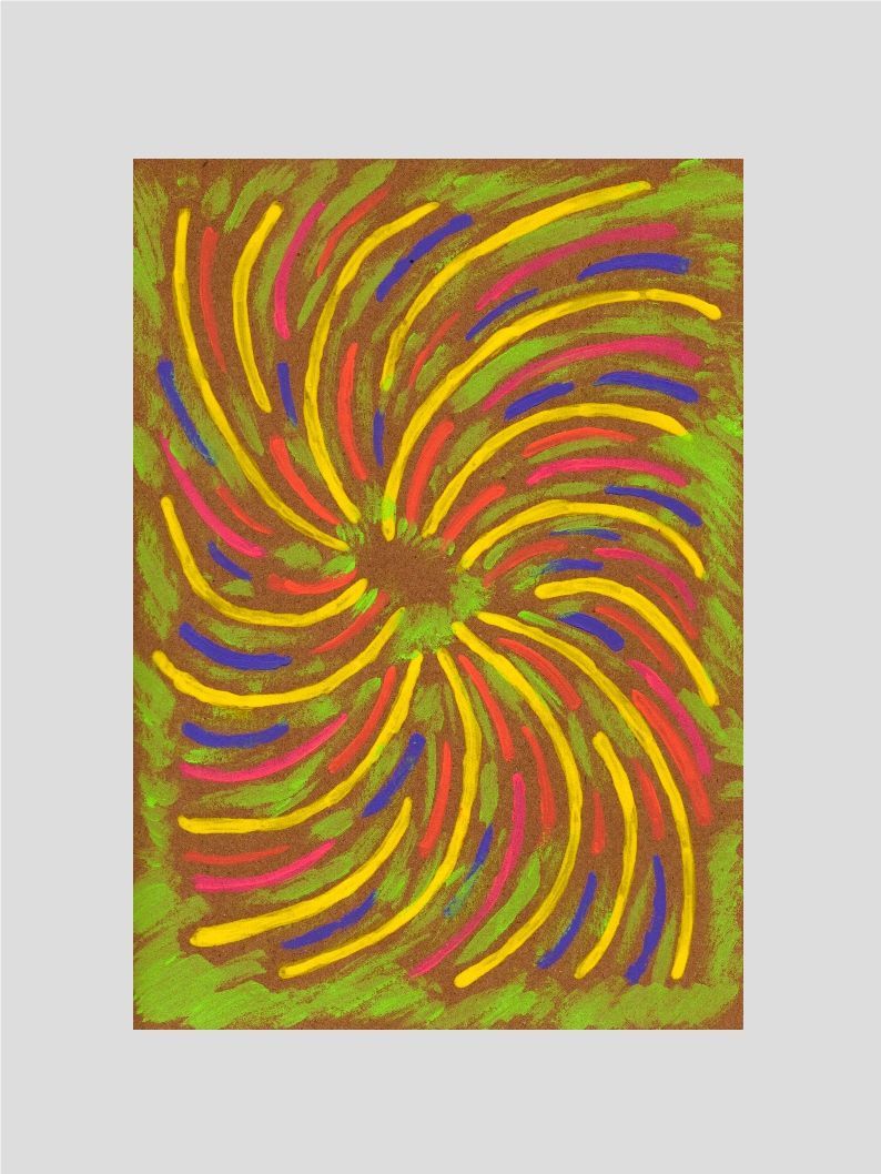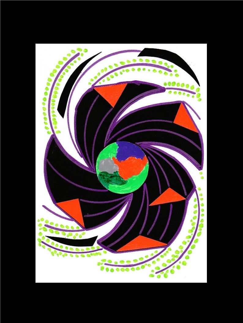 In der Mitte ist ein rotierender Gedanke. Mit jeder Umdrehung schleudert der Gedanke funken, Gedankenfunken in seine Umgebung. Ein Feuerrad voller Energie.