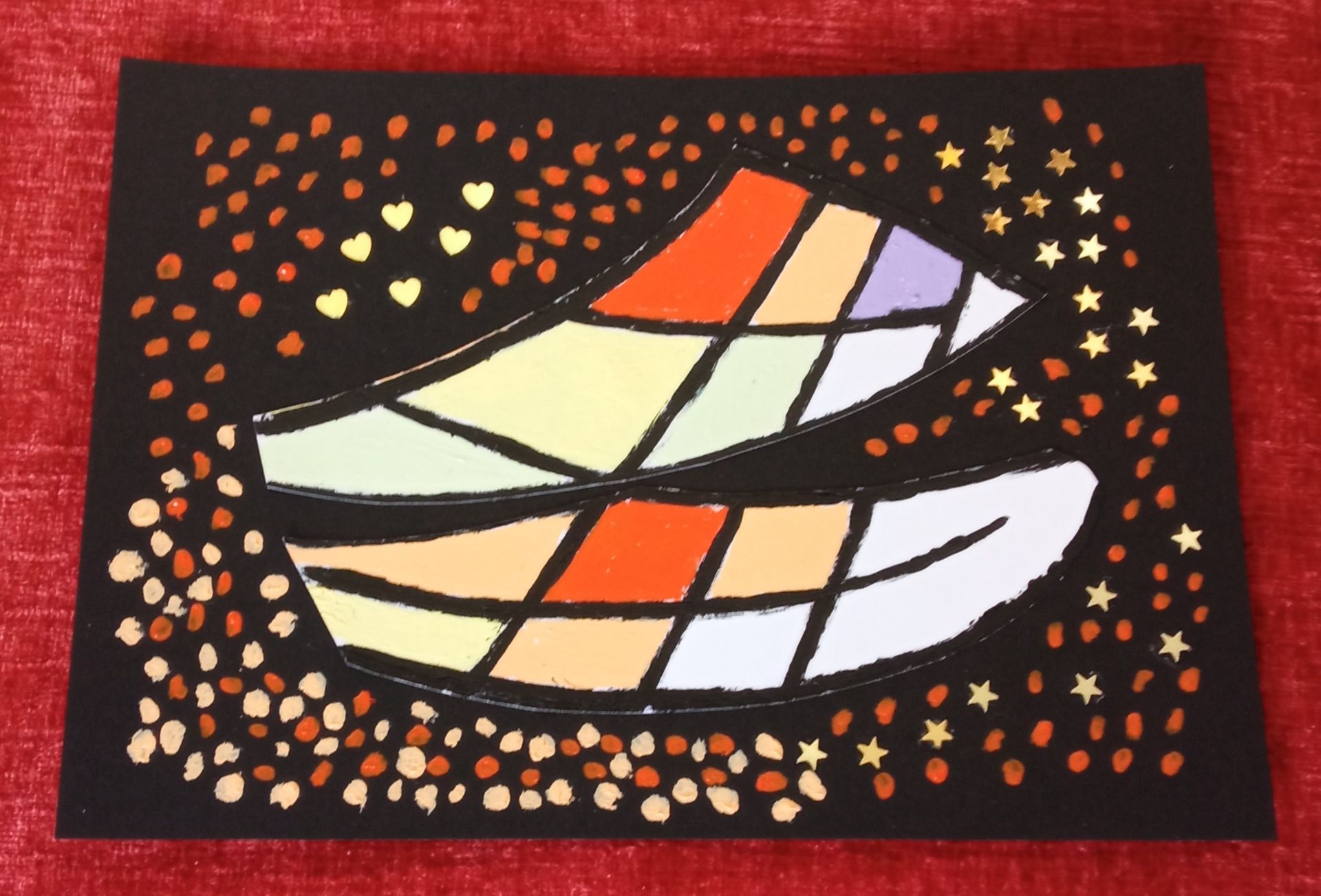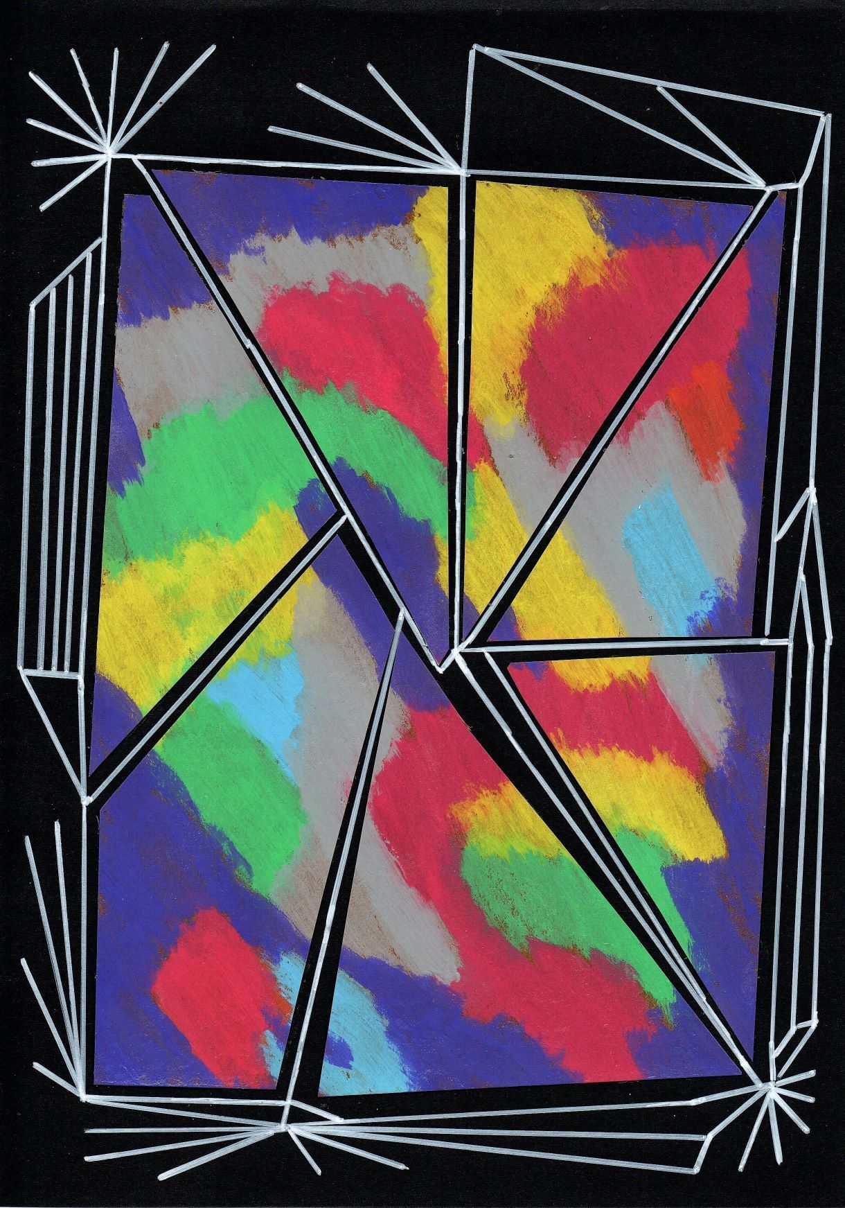 Aus bemalten Papierresten zusammengeklebt und dann mit Acrylstiften dekoriert. DIN A5